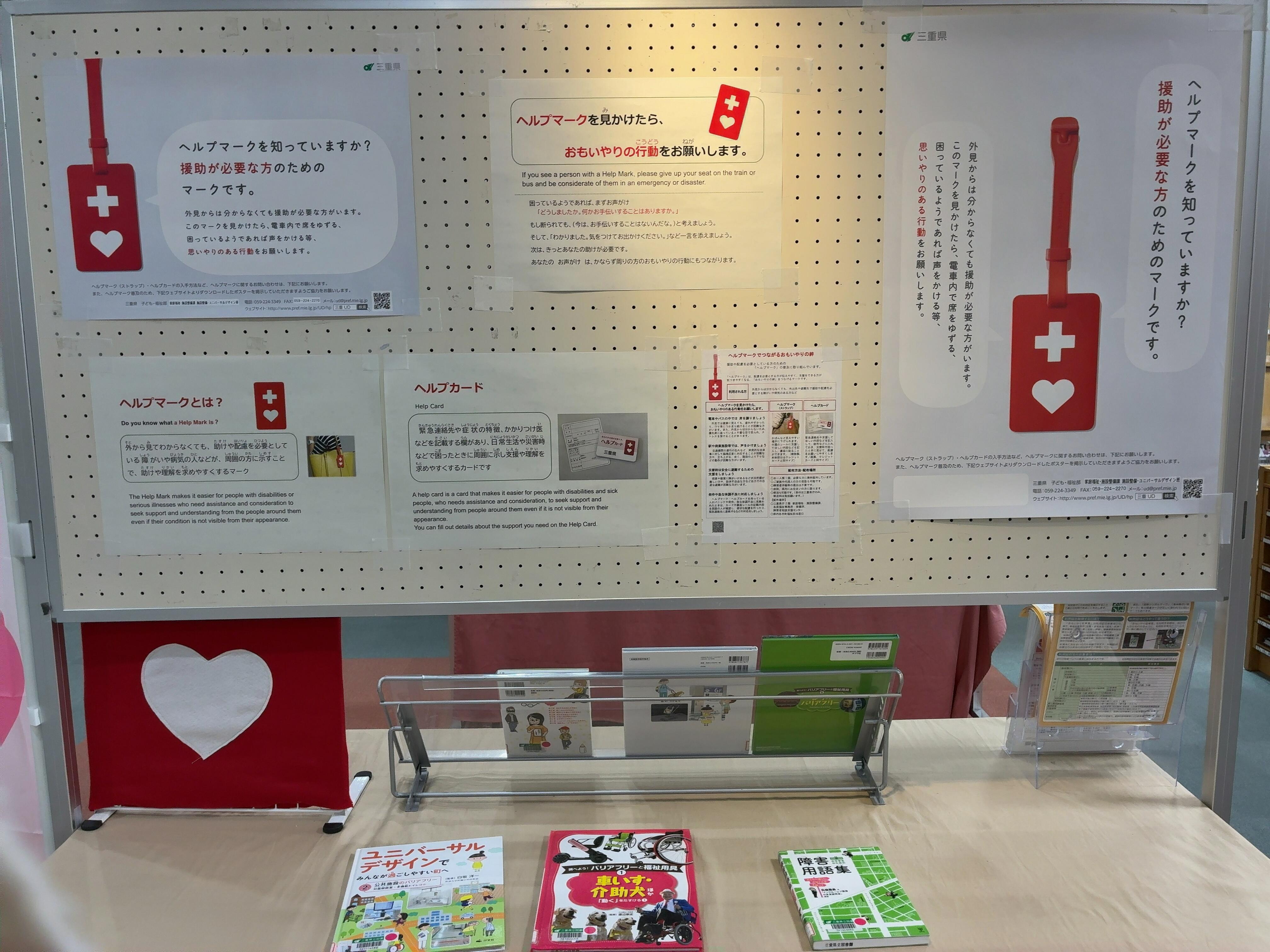 三重県立図書館では、三重県子ども・福祉部家庭福祉・施設整備課と連携し、「ヘルプマーク」に関する展示を行っています。