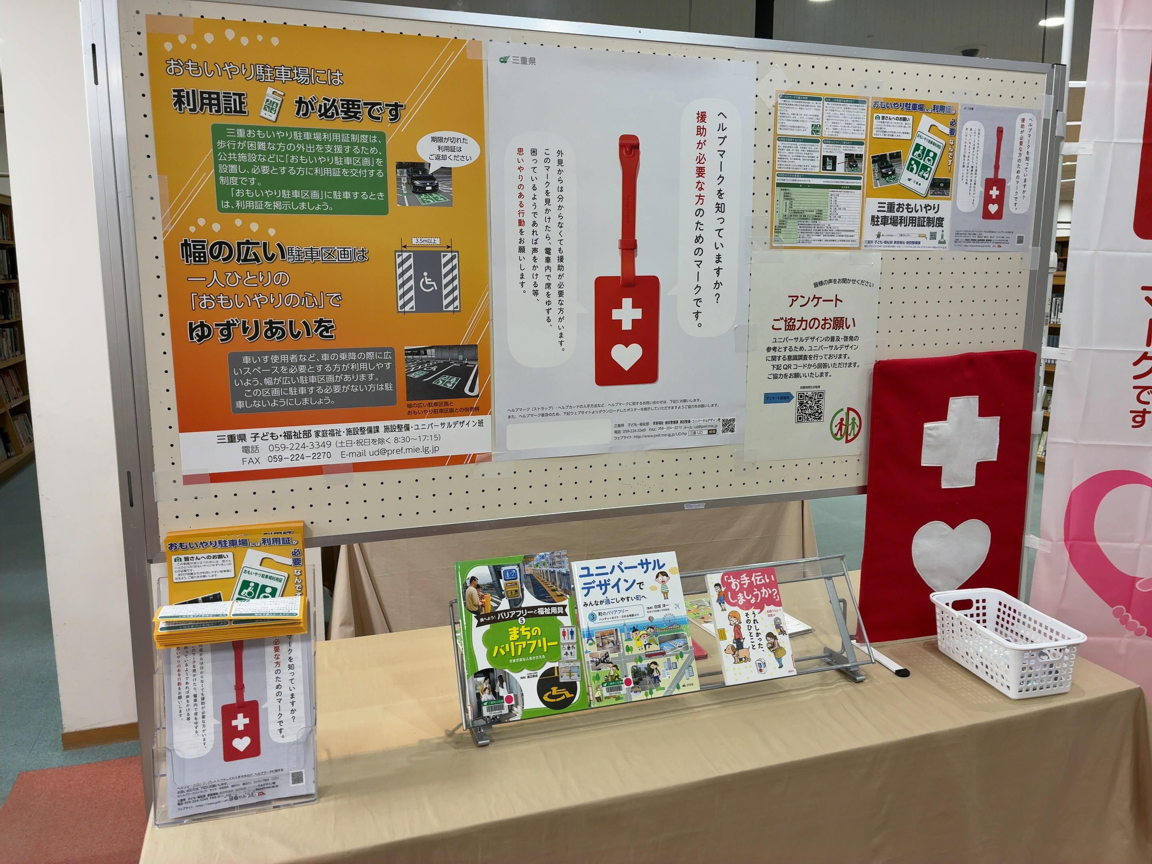 三重県では、「三重県ユニバーサルデザインのまちづくり推進計画」を策定し、だれもが自由に社会参加できるユニバーサルデザインのまちづくりを進めています。「ヘルプマーク」や「三重おもいやり駐車場」に関する掲示や啓発物の配布のほか、ユニバーサルデザインに関する本を展示しています。