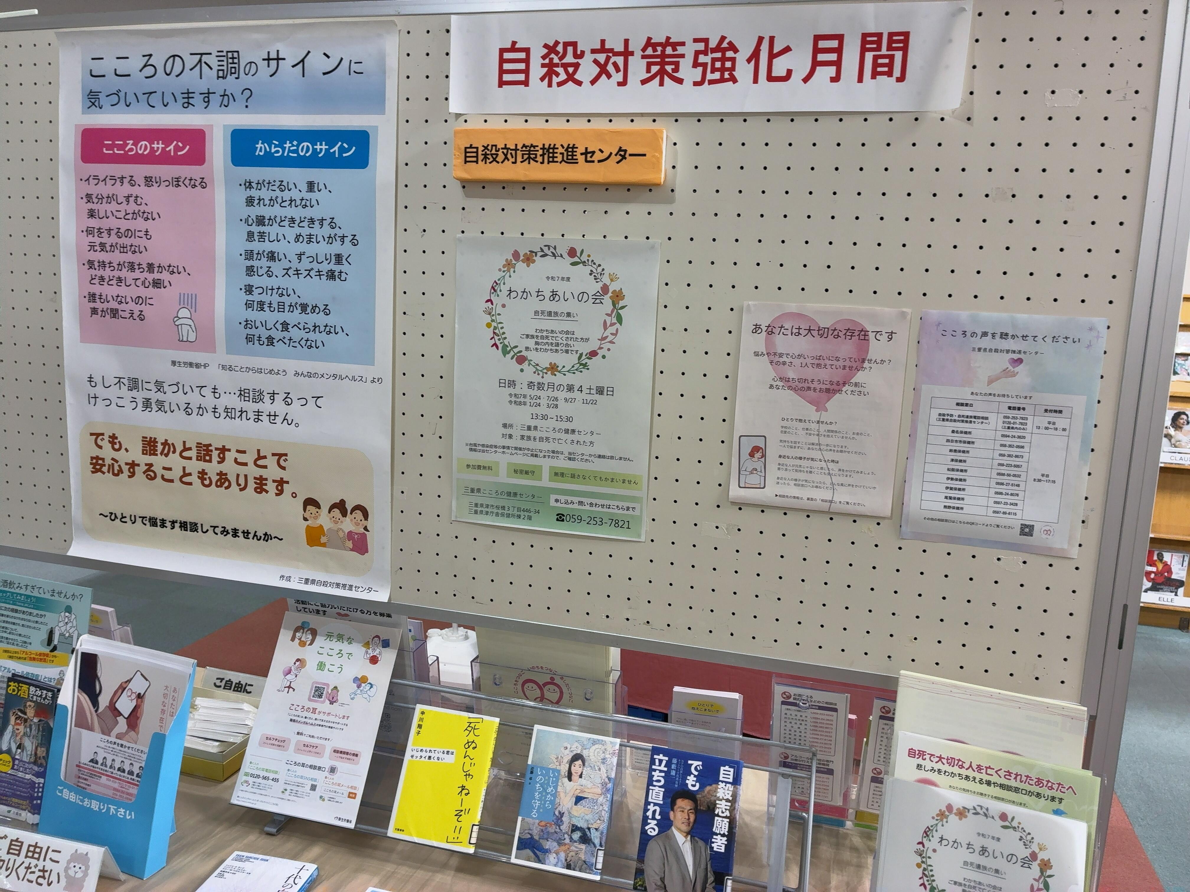 三重県立図書館では、三重県こころの健康センターと連携し、「自殺対策強化月間」に関する展示を行っています。