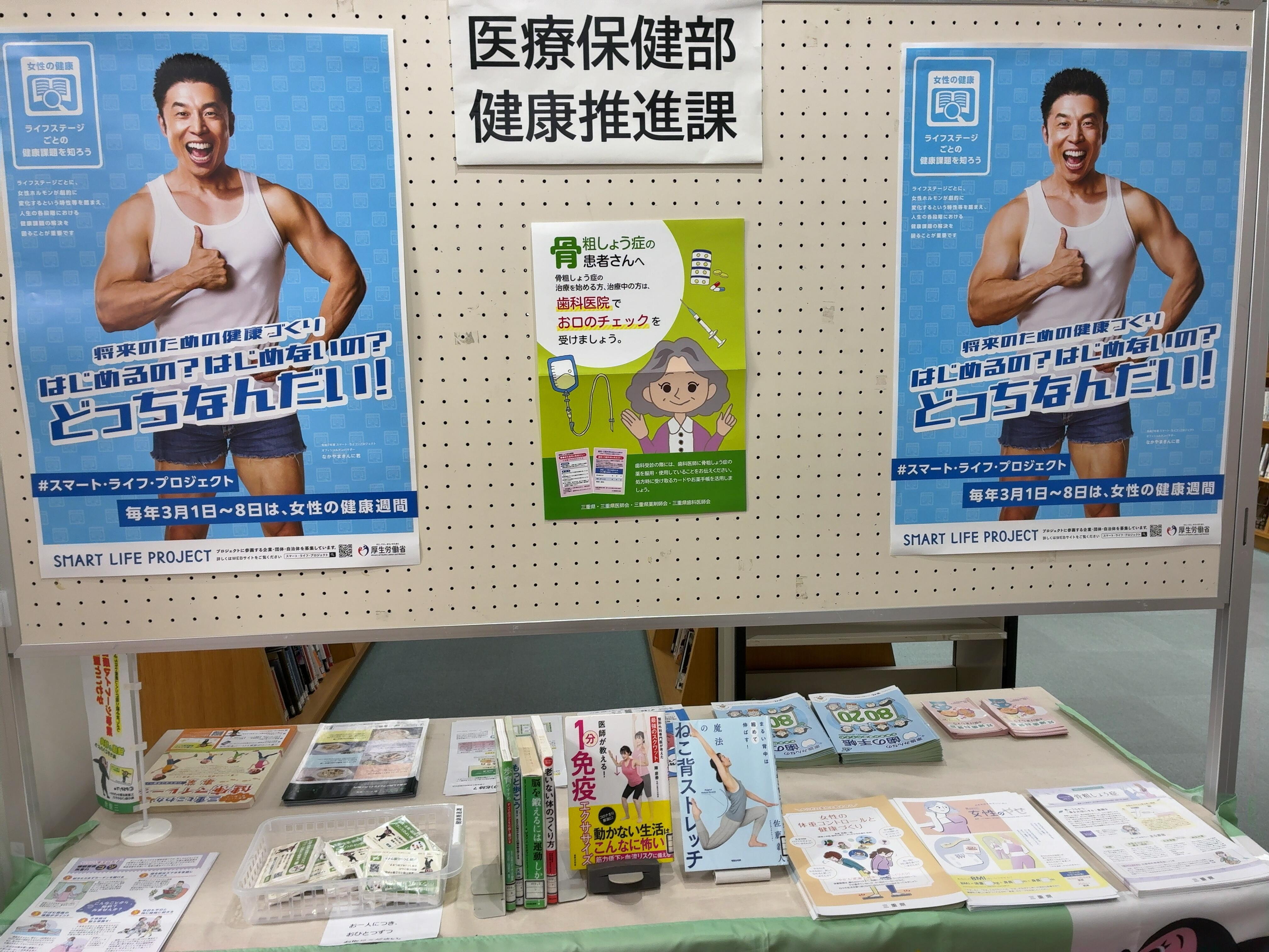 三重県立図書館では、三重県医療保健部健康推進課と連携し、「三重とこわか健康マイレージ」に関する展示を行っています。